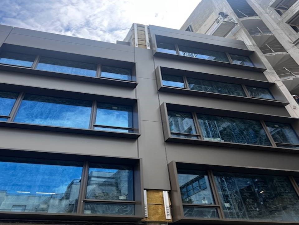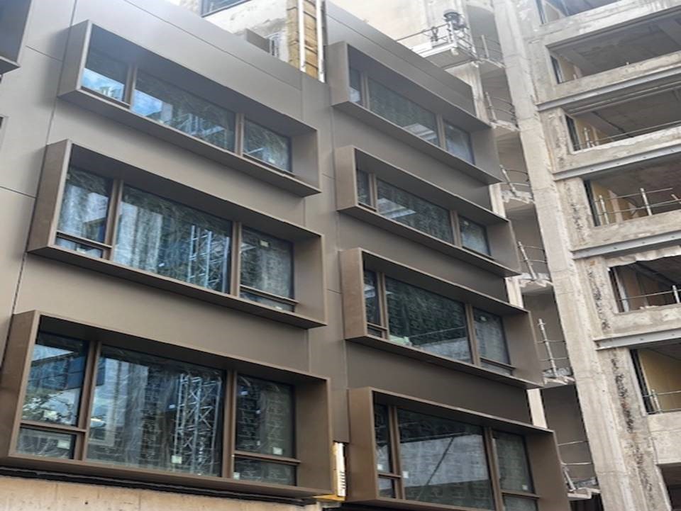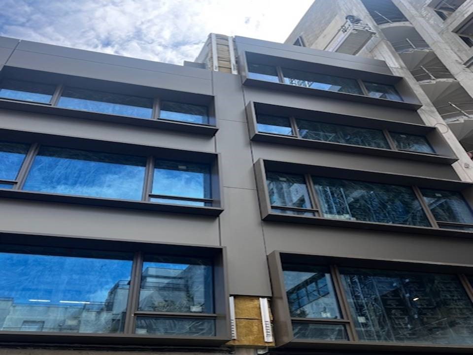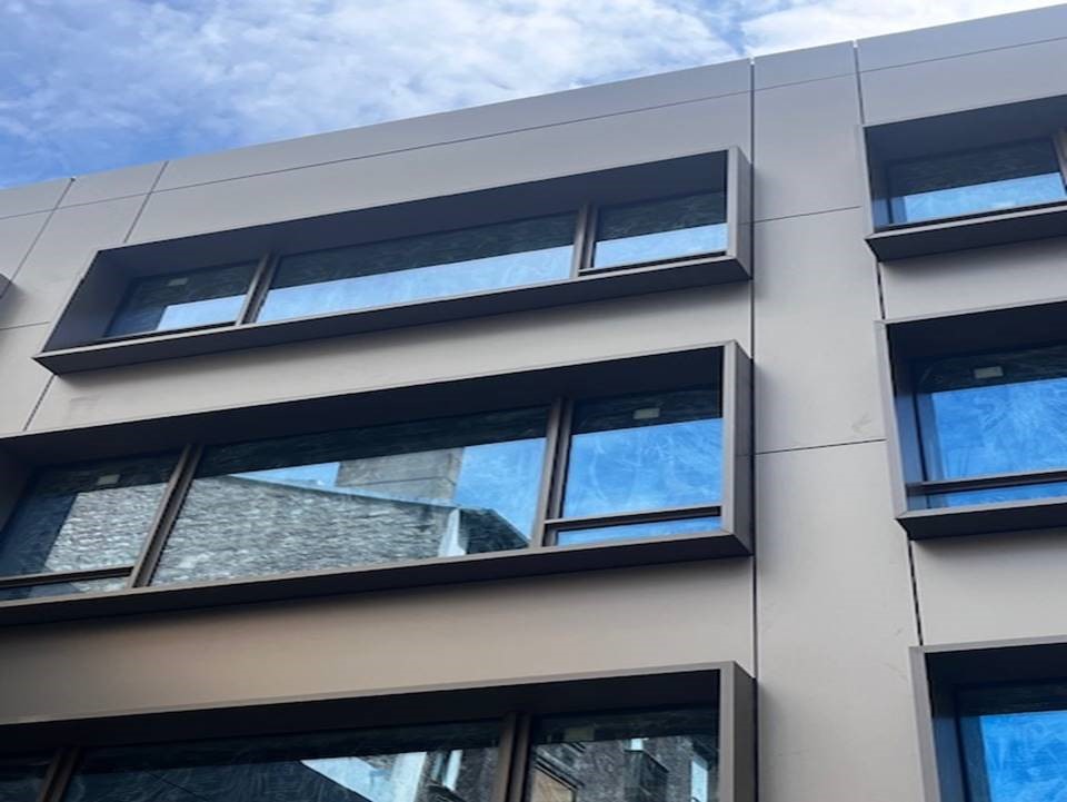 Les façades lisses côté rue se distinguent par la mise en œuvre du système Inno®E1, composé de cassettes bordées quatre faces par fraisage, fixées de manière invisible par encoches sur profils oméga aluminium. Cette technique assure un rendu parfaitement plan et raffiné, en cohérence avec la sobriété des lignes urbaines.