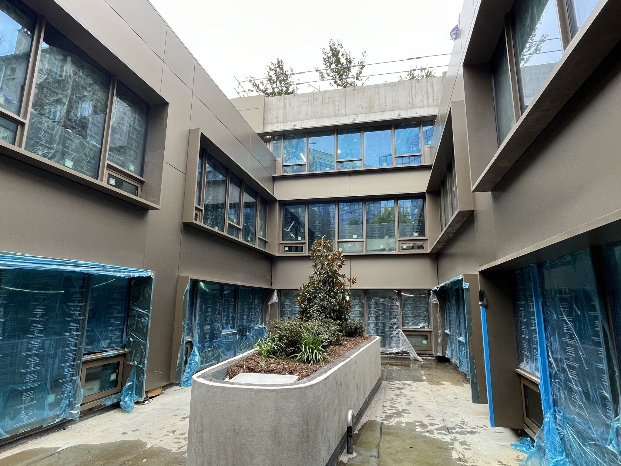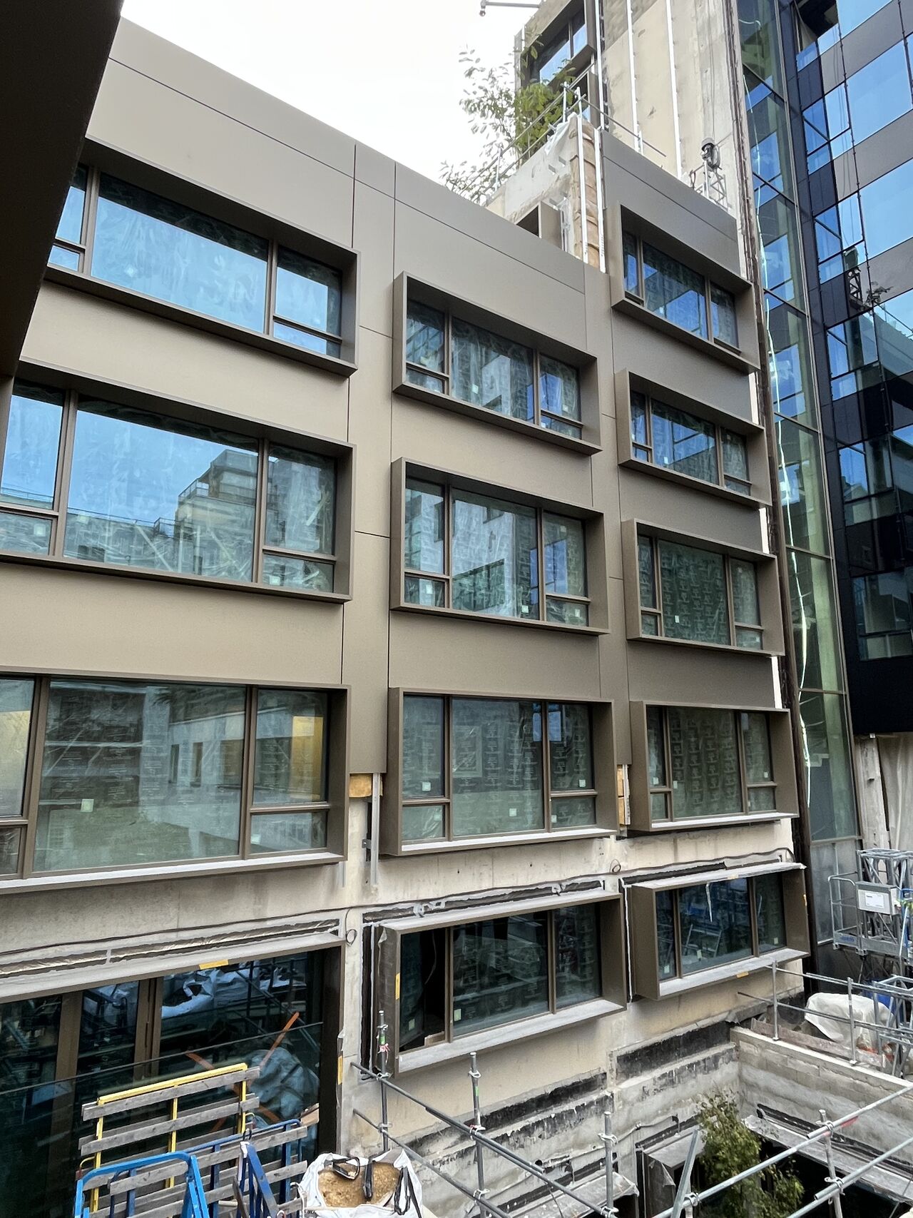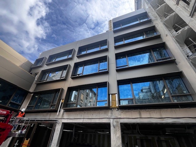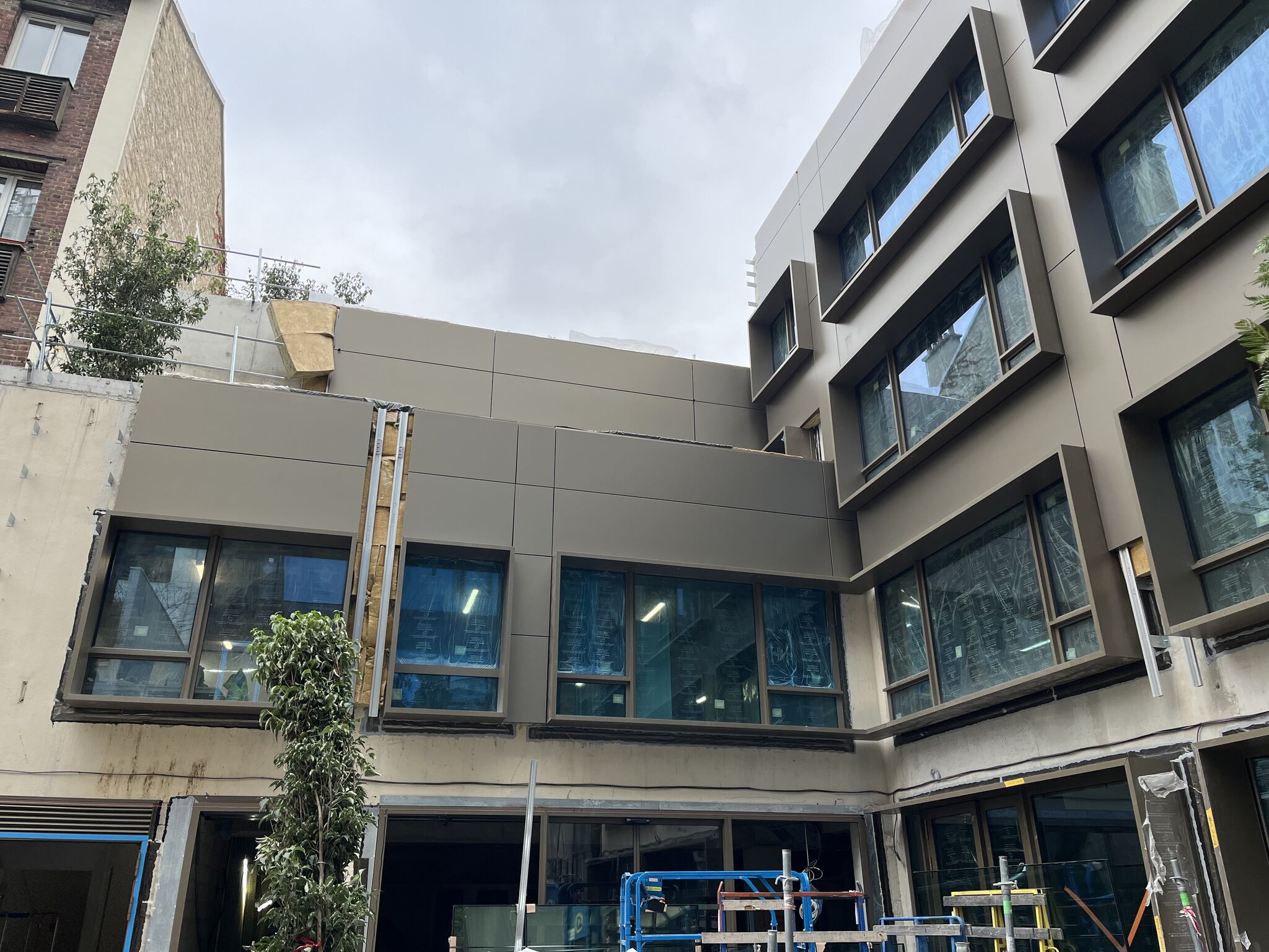 Les façades lisses côté rue se distinguent par la mise en œuvre du système Inno®E1, composé de cassettes bordées quatre faces par fraisage, fixées de manière invisible par encoches sur profils oméga aluminium. Cette technique assure un rendu parfaitement plan et raffiné, en cohérence avec la sobriété des lignes urbaines.