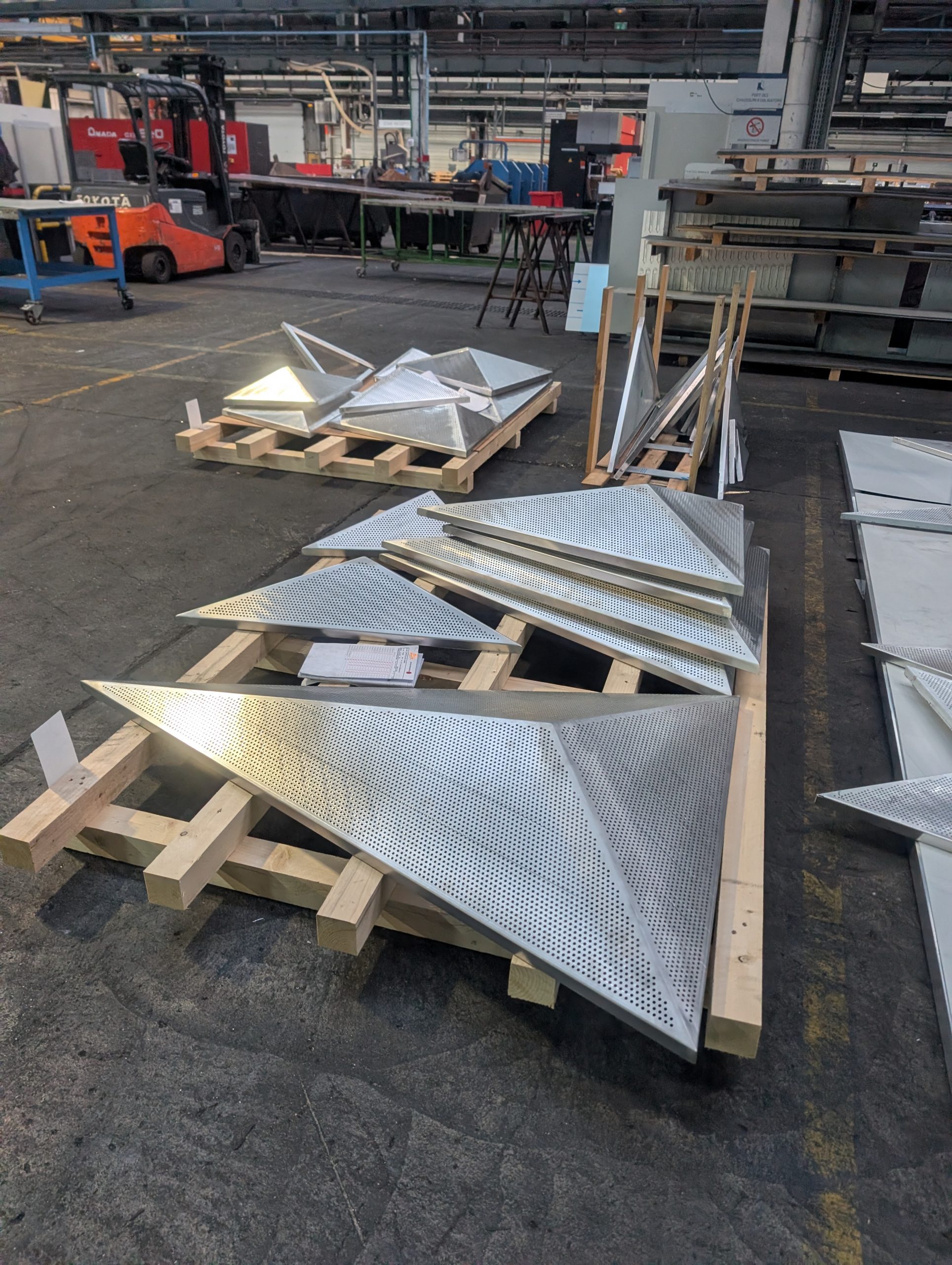 - Chaque module triangulaire, façonné par pliage et soudure, est assemblé mécaniquement sur un cadre acier mécano-soudé.