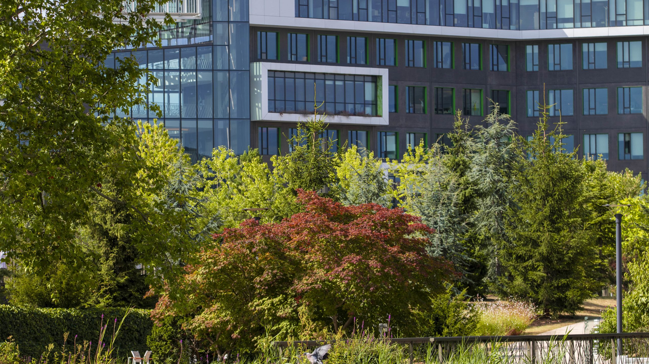 L’opération se compose de trois bâtiments interconnectés, totalisant plus de 26 000 m² de surface, articulés autour d’un vaste atrium central qui relie les espaces de travail au jardin public voisin. Ce cœur lumineux favorise les échanges entre usagers tout en ouvrant généreusement le bâtiment sur la ville.