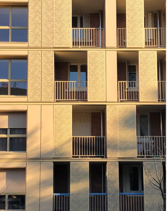 À Arcueil, au cœur du quartier du Chaperon Vert, l’opération de réhabilitation rend hommage à l’héritage architectural de Jacques Poirier, disciple d’Auguste Perret, en préservant la rigueur et l’élégance du système constructif d’origine. Conçu entre 1955 et 1965, cet ensemble emblématique repose sur un tracé urbain structuré et une écriture architecturale répétitive, mêlant structures béton et remplissages en brique. L’intervention vise à renforcer cette cohérence patrimoniale tout en adaptant le site aux standards contemporains de qualité de vie et de confort résidentiel. Les logements ont ainsi bénéficié d’extensions légères et discrètes, implantées dans le rythme existant, permettant d’améliorer les surfaces habitables sans rompre l’équilibre architectural initial.