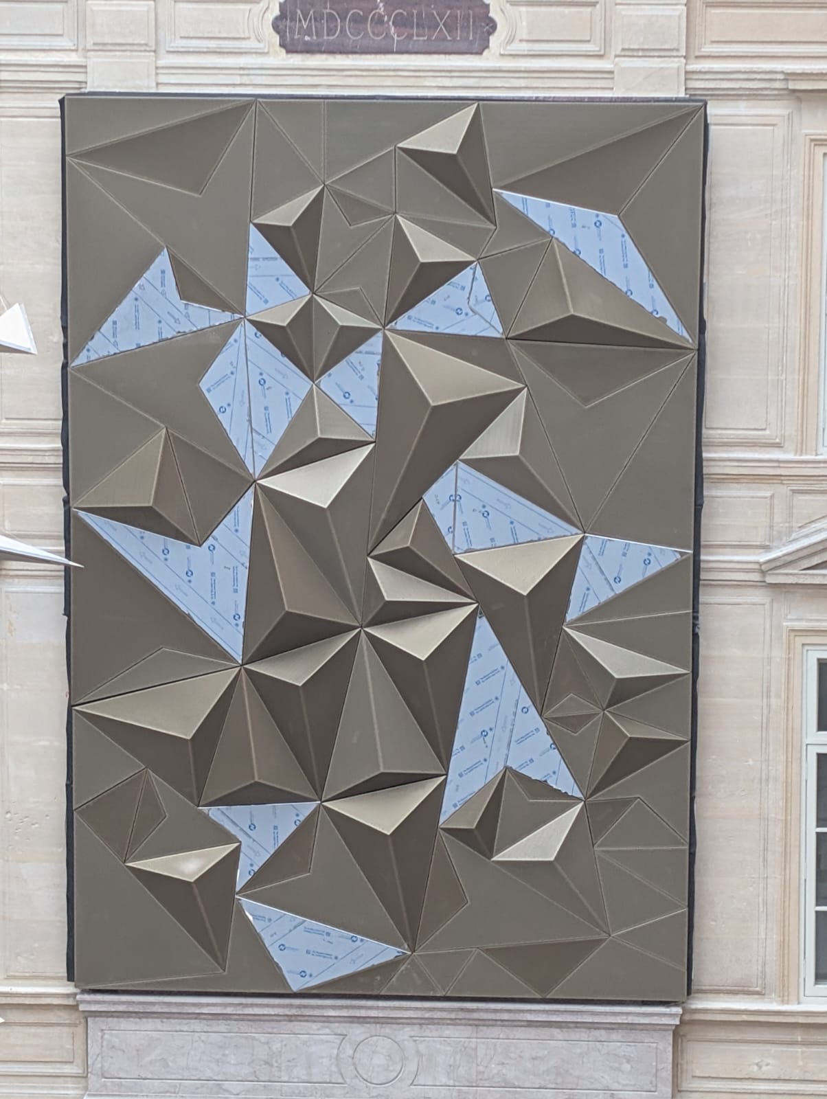 Tout d’abord, l’élément central du projet repose sur la réalisation d’une plaque commémorative métallique de 30,89 m², conçue grâce à notre solution InnoB Système B2. Cette structure se compose de modules triangulaires en acier, façonnés par pliage et soudure, puis assemblés tel un puzzle sur un cadre mécano-soudé. De plus, une perforation décorative a été intégrée afin de répondre aux exigences acoustiques tout en apportant une dimension esthétique forte.