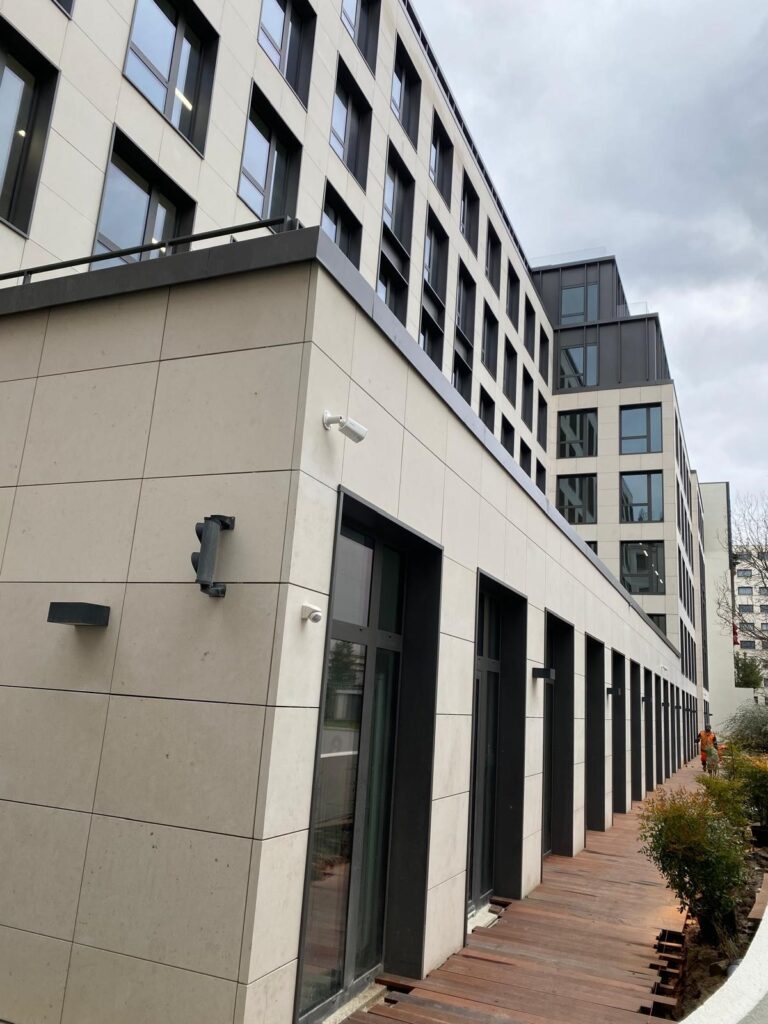 Notre intervention porte sur 783 m² de façades, fabriquées selon le procédé InnoF® Système F1, un système de cassettes pliées et montées par poinçonnage avec fixation semi-visible en fond de joint creux. Cette solution assure une qualité de finition élevée, la précision des alignements et une grande stabilité dimensionnelle pour des formats pouvant atteindre 3400 mm de hauteur.
