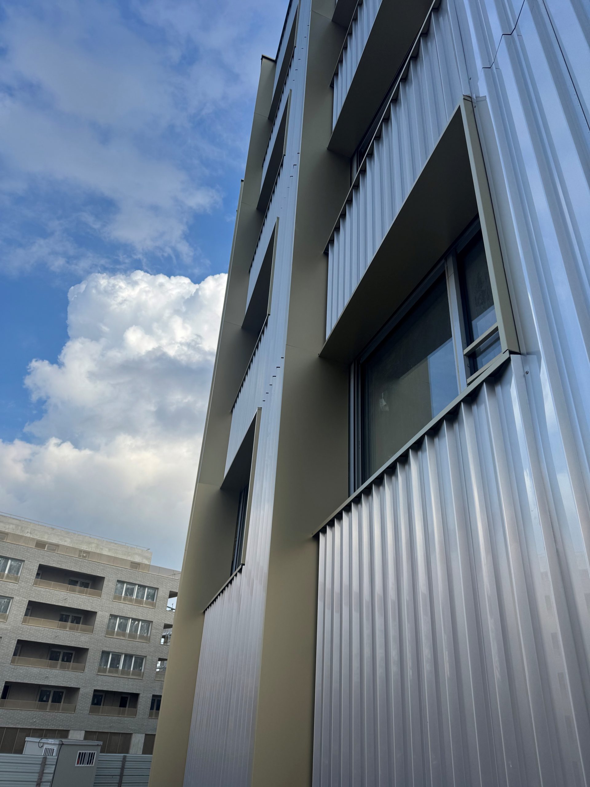 Les façades intérieures, quant à elles, adoptent un bardage nervuré InnoF® système F4, posé sur ossature cintrée en acier galvanisé, garantissant la continuité visuelle et les performances thermiques du bâtiment.