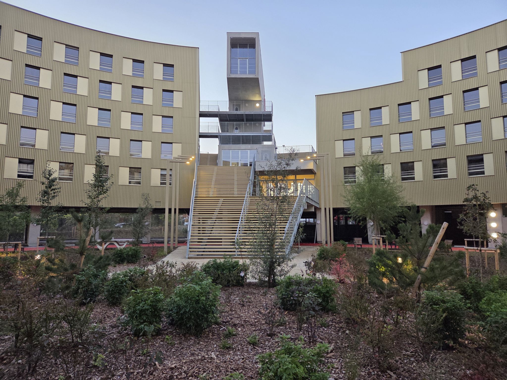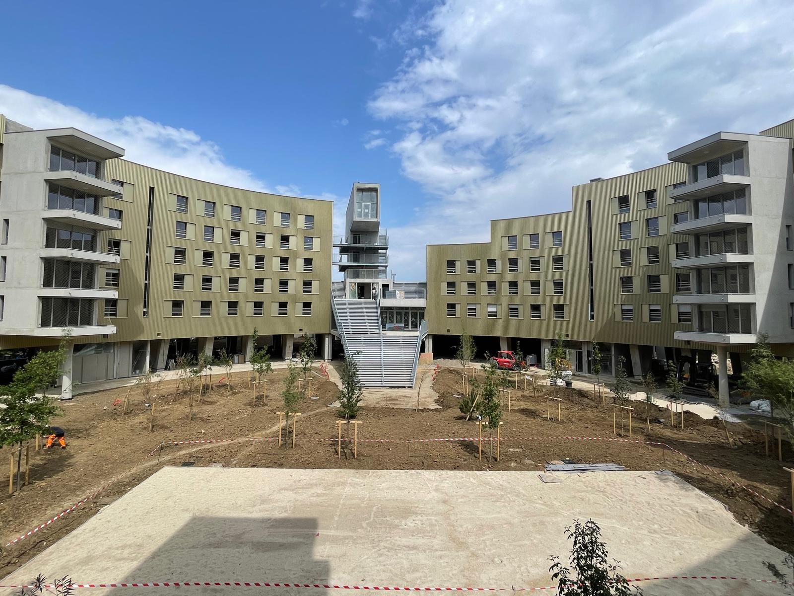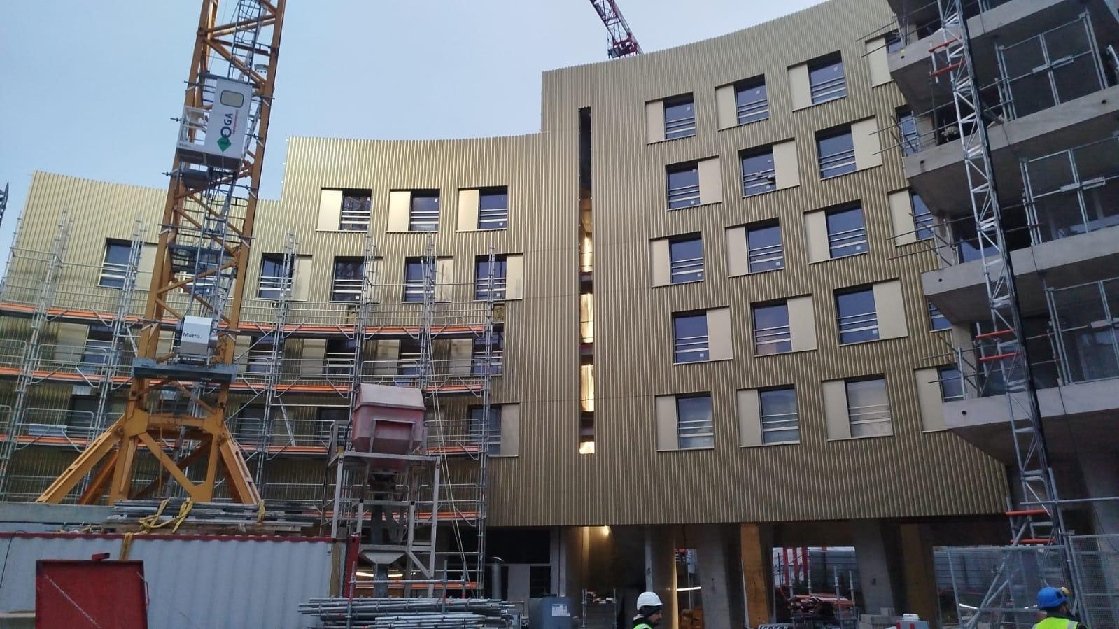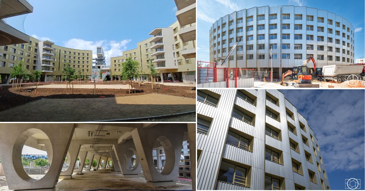 Ce vaste programme immobilier comprend une résidence étudiante de 220 logements, un immeuble de bureaux, des commerces en rez-de-chaussée et un parking silo.